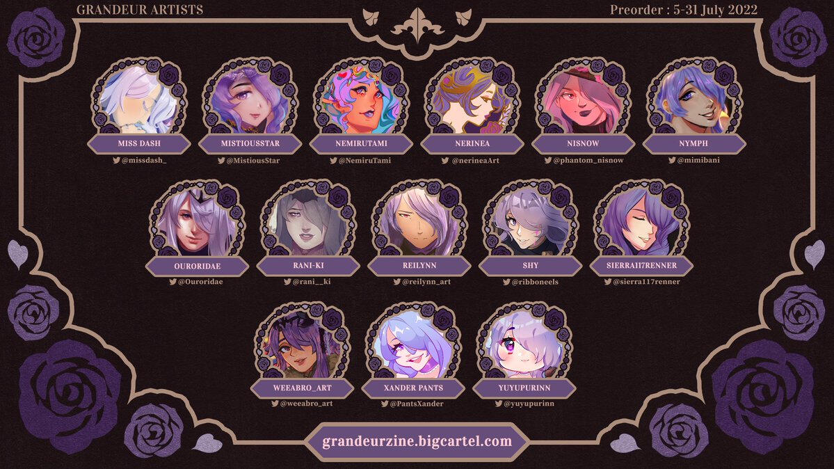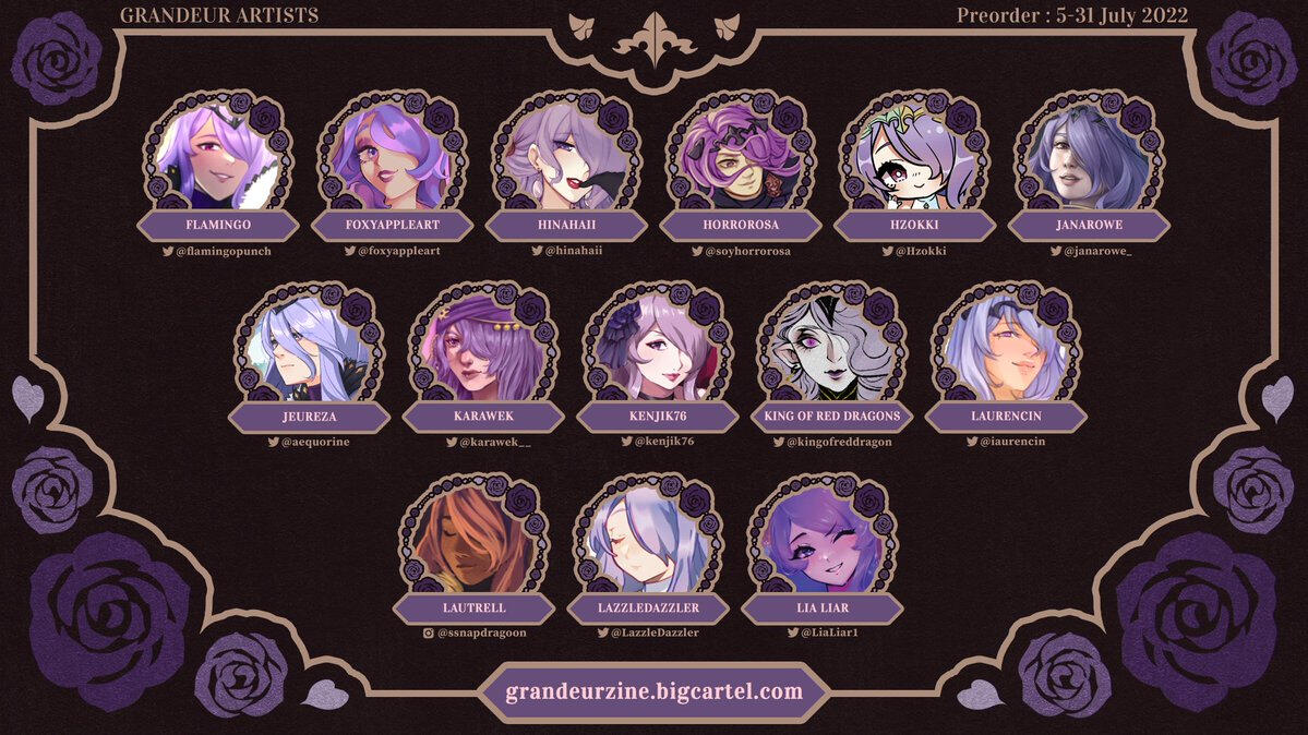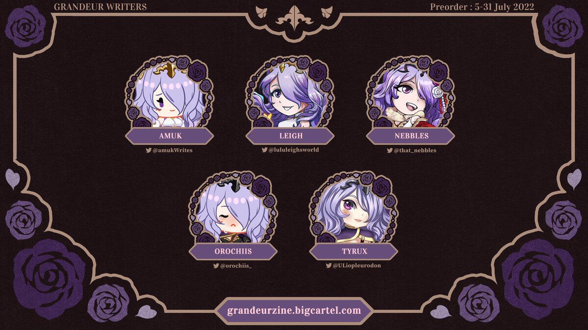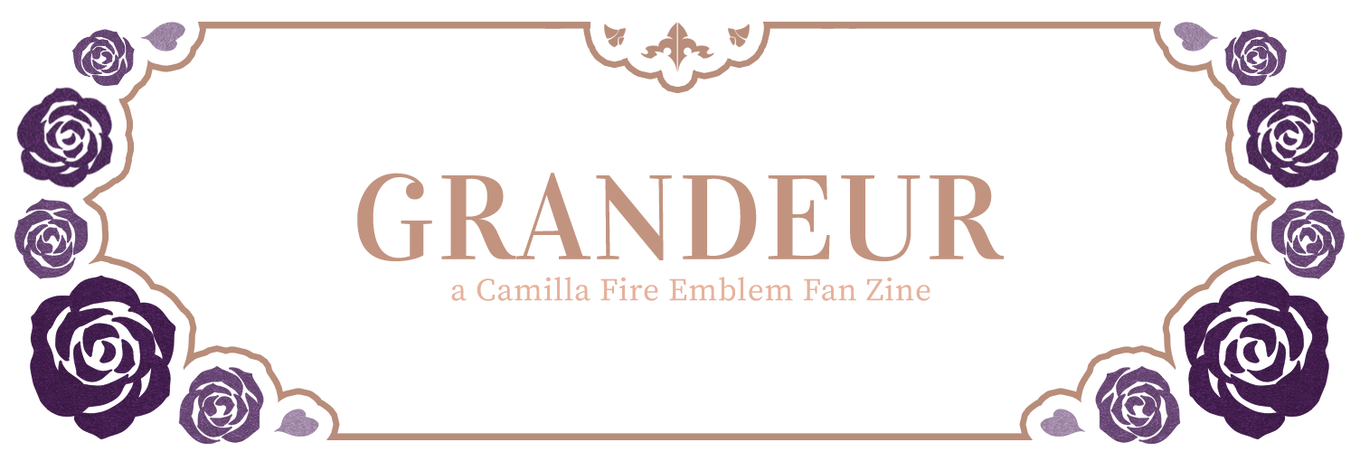 Grandeur is a fanzine project celebrating Camilla from Fire Emblem Fates. It was crowdfunded and published in 2022.Camilla is a muse to many, continuing to captivate fans and creators long after her initial appearance in Fates. Her ravishing purple locks, unparalleled beauty, deadly strength with which she protects those dear to her, and many more extraordinary qualities keep us coming back to her again and again. We want to create one book that will, for the first time, bring together everything that we love about Camilla, a compilation of love letters through art, a place we can keep coming back to to relive iconic memories from Fates and beyond.We want to create and self-publish an artbook that depicts Camilla in all canon and alternate forms, including holiday and other alts introduced in FE Heroes. And why not even create some of your own? We can't wait to see which exciting new directions our shared muse will take you!
