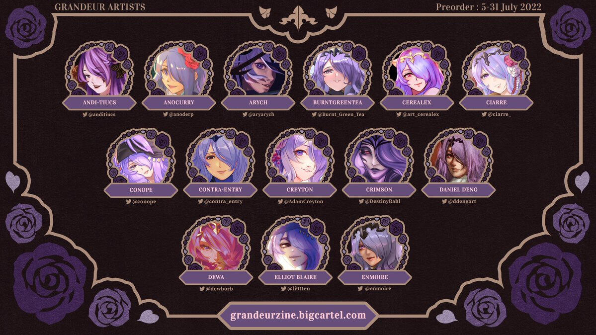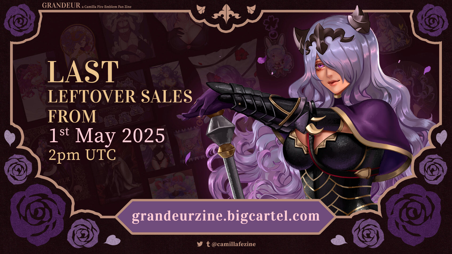 Grandeur is a fanzine project celebrating Camilla from Fire Emblem Fates. It was crowdfunded and published in 2022.Camilla is a muse to many, continuing to captivate fans and creators long after her initial appearance in Fates. Her ravishing purple locks, unparalleled beauty, deadly strength with which she protects those dear to her, and many more extraordinary qualities keep us coming back to her again and again. We want to create one book that will, for the first time, bring together everything that we love about Camilla, a compilation of love letters through art, a place we can keep coming back to to relive iconic memories from Fates and beyond.We want to create and self-publish an artbook that depicts Camilla in all canon and alternate forms, including holiday and other alts introduced in FE Heroes. And why not even create some of your own? We can't wait to see which exciting new directions our shared muse will take you!
